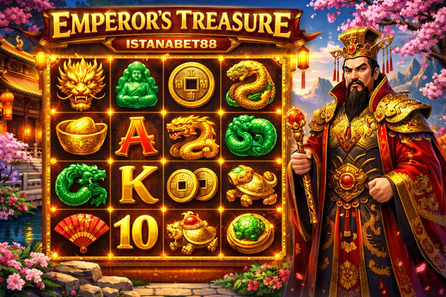 Simbol naga emas dan lampion merah menciptakan suasana oriental yang kental dengan keberuntungan dan kemakmuran yang sangat diharapkan oleh para pemainnya. Musik latar yang menenangkan berpadu sempurna dengan animasi naga yang terbang mengelilingi layar saat fitur spesial berhasil diaktifkan oleh sang pemain.